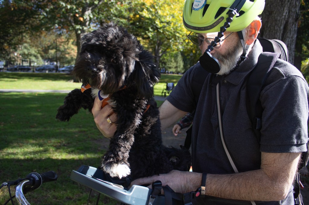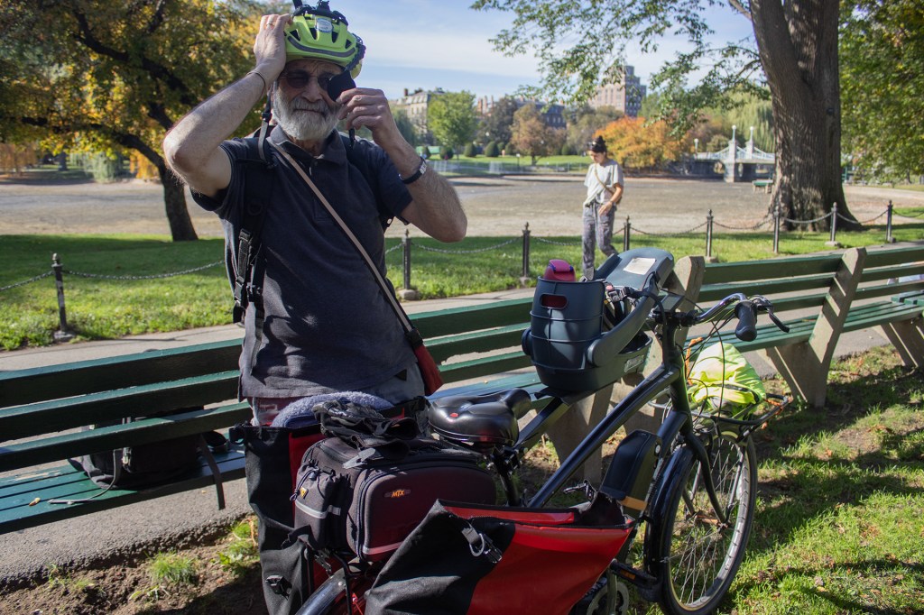 Guy(left), Don(middle) and John(right) unexpectedly played together at Boston Public Garden.Don and John have been long-time musical partners, frequently playing together by the lake. One day, they met Guy, a sophomore at Berklee College of Music, who was playing there and they formed a group together.Don,72 ,played banjo and John, 73, played violin.A child stood in front of them, holding a bill, but hesitated to approach.The seven-month-old black poodle, Snoop, accompanies John to the Public Garden every time he plays.John and Don have a list of songs they play in sequence.Guy, a sophomore at Berklee College of Music, met John and Don and formed a group with them that day.John commutes on his bike from Brookline to Boston Public Garden.Don was showing a photo of his granddaughter to John.The bike has a baby seat for Snoop to sit in.