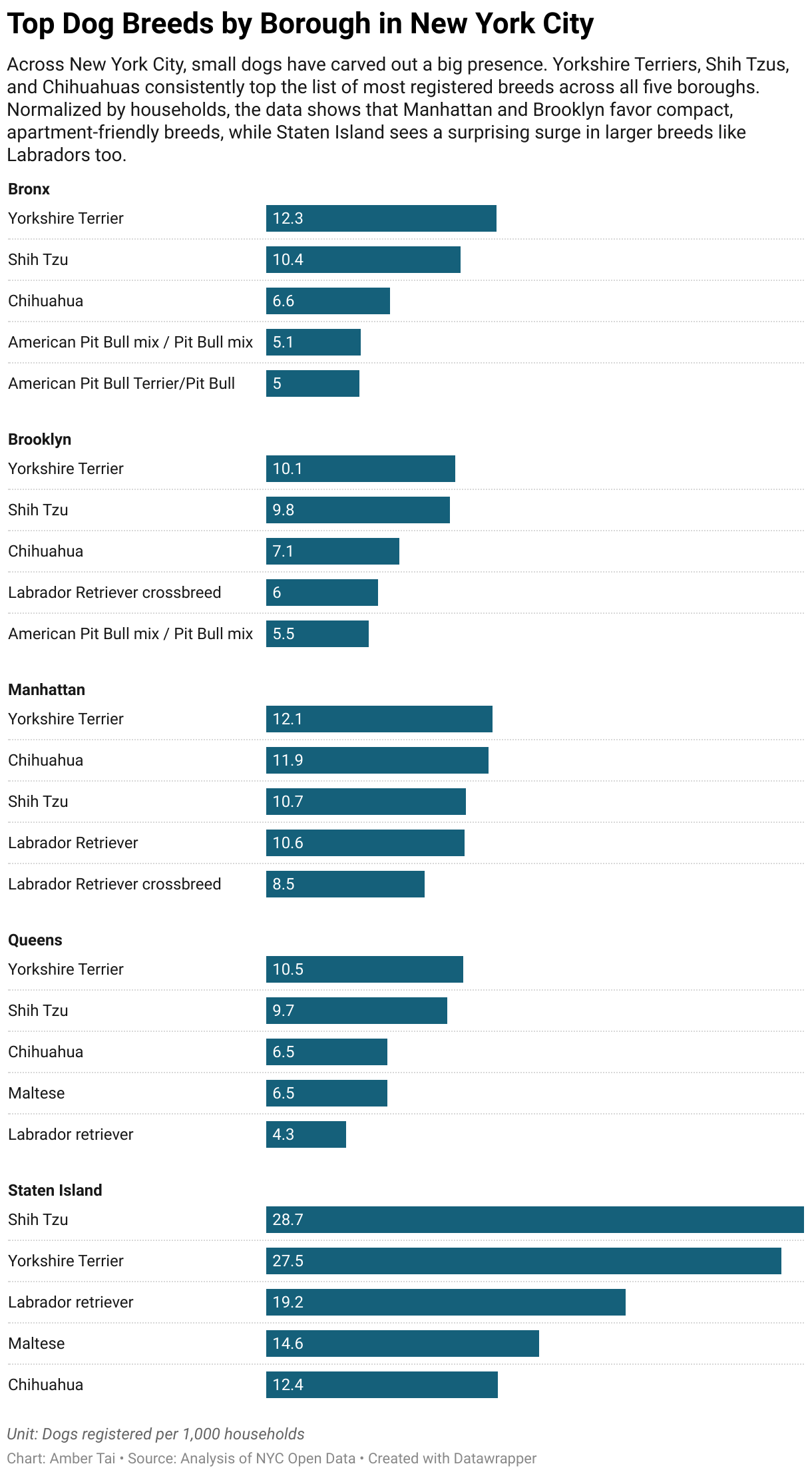 The top three most-registered breeds—Yorkshire Terriers, Shih Tzus, and Chihuahuas—are all small pups, usually under 15 pounds. No surprise there: in a city of walk-ups, tiny apartments, and crowded sidewalks, being compact is basically a survival skill.