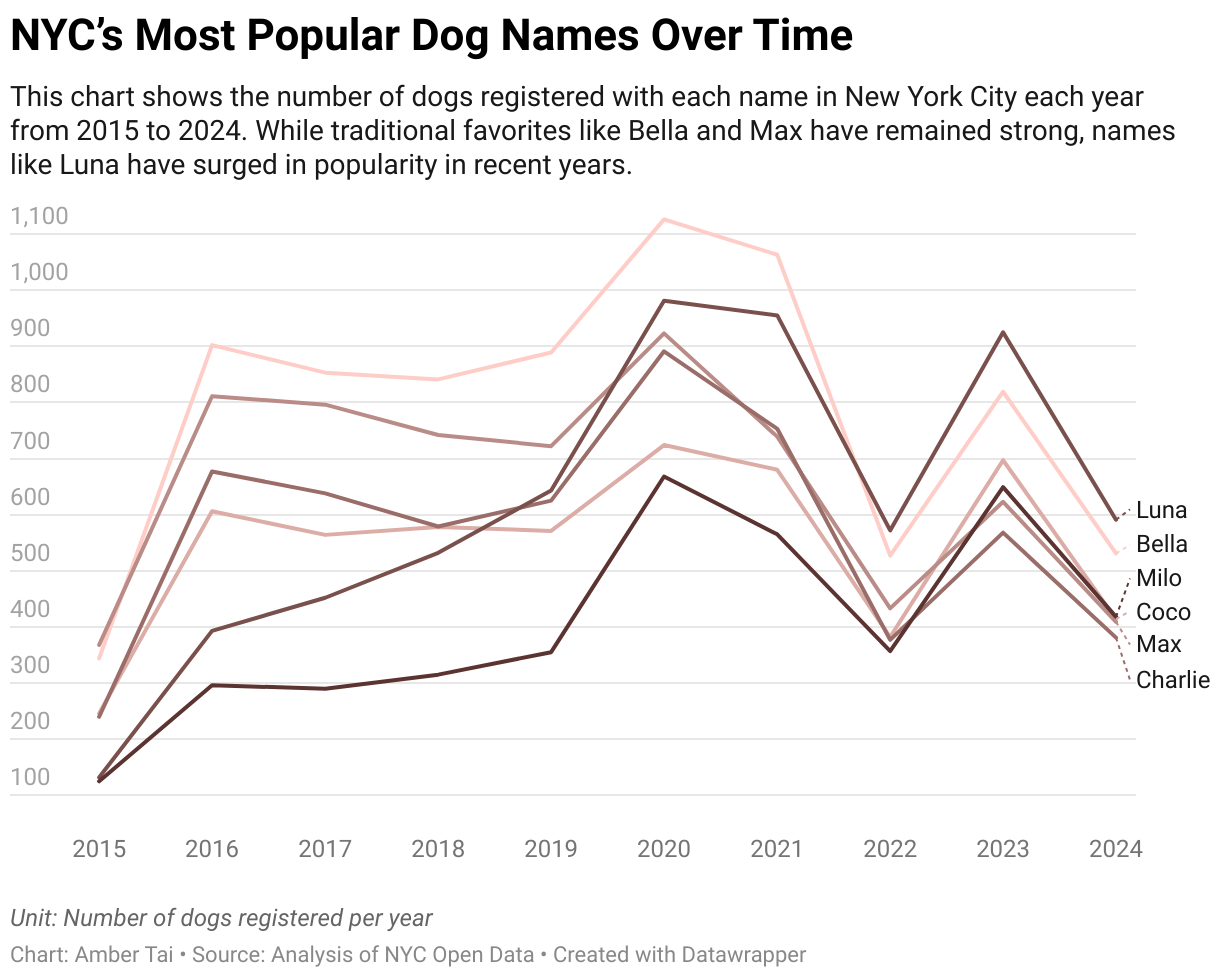 Here’s something fun: Bella and Max have been holding it down for years as the city’s most popular dog names. But keep an eye on Luna — she’s the rising star. Over the past few years, Luna has shot up in popularity, nudging out some of the old favorites.