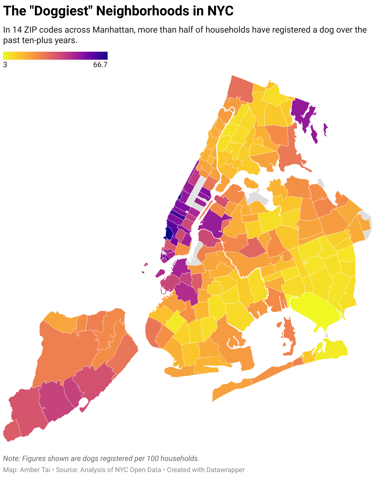 Here’s the map: it shows the number of registered dogs per 100 households across New York City. And Manhattan lights up.